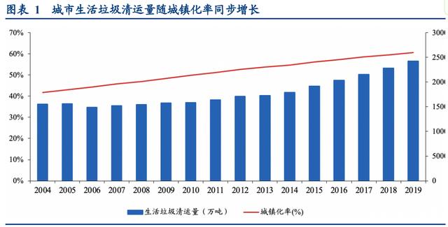 截至 2019 年,我国城镇化率已达 60.6%,提前完成“十三五”规划提出的到 2020 年实 现城镇化率达到 60%的目标,预计到 2025 年,中国城镇化率有望达到 66.5%。城镇化率 提升推动居民生活水平的提高,进而消费水平提升将从源头带来稳步增长的垃圾清运量。 2019 年我国城镇垃圾清运量达到 2.4 亿吨,同比增加 6.16%,假设 2020-2025 年年均增速6.5%,预计到 2025 年城镇生活垃圾清运量有望达 3.53 亿吨。
