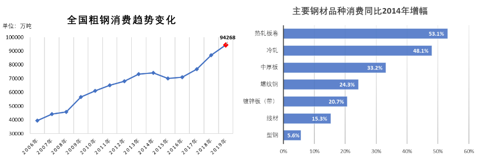 从近些年主要钢铁品种供应变化幅度来看,仅钢筋、热轧板卷、冷轧板卷、中厚板和涂镀五大品种同比供应有所增加,增产原因则主要在于国内房地产、基建、家电、汽车、机械等行业发展迅速,加之产能集中度较高,企业发展规划较为齐全。而线盘、带钢、钢管、型钢等品种国内供应出现明显下降。其中线盘、带钢减产主因则在于品种替代性偏高,而钢管和型钢供应水平偏低主要则在于下游终端行业,例如能源化工、钢结构工程等行业目前发展动力不足,使得部分小型企业在市场的洗礼下逐渐淘汰。但是从目前国家发展目标来看,薄板、不锈板、镀锌板、镀锡板、家电板、轿车板等高性能、高附加值的钢材品种还不能满足国民经济各部门发展需要的局面,未来发展将出现明显变化。另外,作为钢筋、线材、小型材、焊管为代表的普通钢材明显出现了供大于求,后期将会迎合工信部压缩粗钢的行业规划而有出现供应结构调整的趋势。