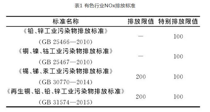 我国有色行业主要污染物排放标准的NOx排放限值见表1。