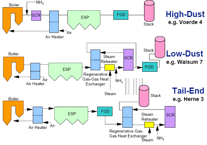 According to the relative position of SCR denitrification reactor installation, SCR system has three ways: high dust arrangement, low dust arrangement and tailing arrangement.