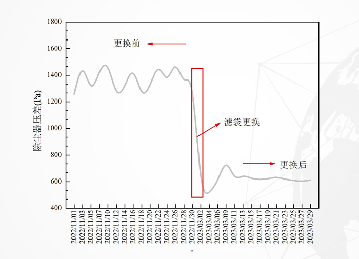 以中国某水泥厂窑尾袋式除尘系统改造项目为例,对除尘器中滤袋更换连续稳定运行前后的平均压差变化进行对比,更换高效低阻覆膜滤料后除尘器运行压差明显降低,更换前后除尘器运行压差由1200Pa左右减小至600Pa,下降幅度约为50%,对于客户端来说,最直观的就是能够降低除尘系统运行时的风机能耗。