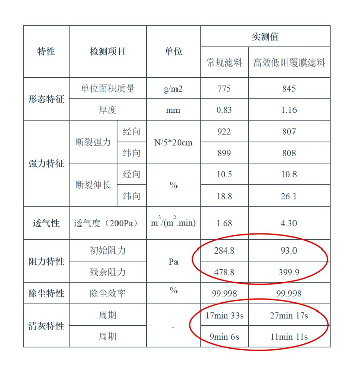 在动态运行状态下:高效低阻覆膜滤料较常规覆膜滤料初始阻力低67.3%、残余阻力低16.5%,表现出低阻特性;常规滤料和高效低阻覆膜滤料除尘效率均为99.998%,表现出高效特性;在清灰方面,高效低阻覆膜滤料也具有更长的清灰周期,表现出低能耗特性。