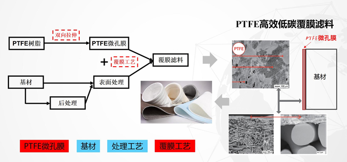 为达到趋零超净排放标准,目前所用袋式除尘技术多为PTFE覆膜滤料,与非覆膜滤料相比,覆膜滤料以表面过滤的形式,迎尘面微孔膜小孔径的特性可实现烟气中粉尘的高精度、高过滤效率分离,但是常规PTFE覆膜滤料有初始压差大、运行阻力高和能耗高的缺点,给客户端造成了高能耗和运营成本的压力,而降低除尘滤袋稳定运行时的压差是能耗和运营成本的关键突破。