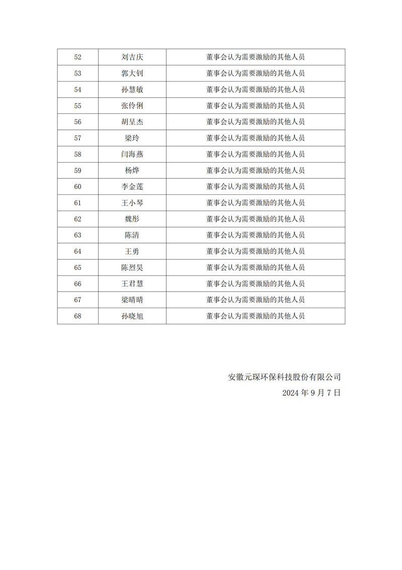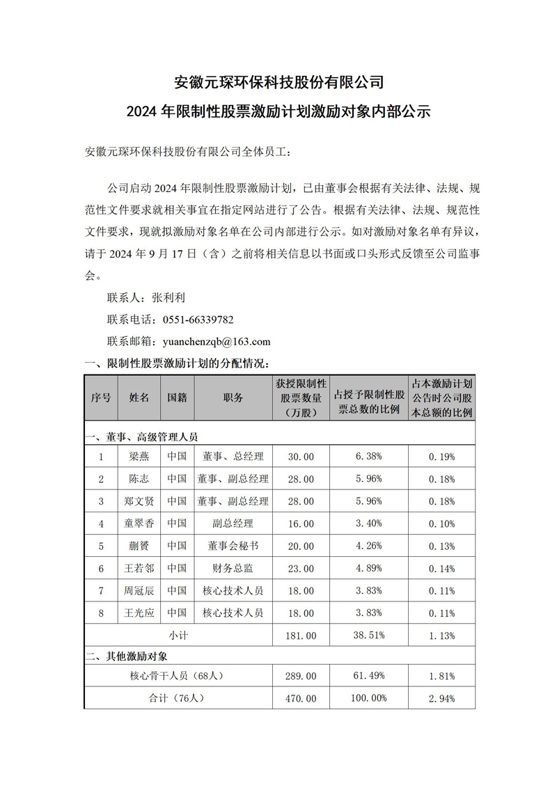 安徽Yy易游体育环保科技股份有限公司 2024年限制性股票激励计划激励对象内部公示