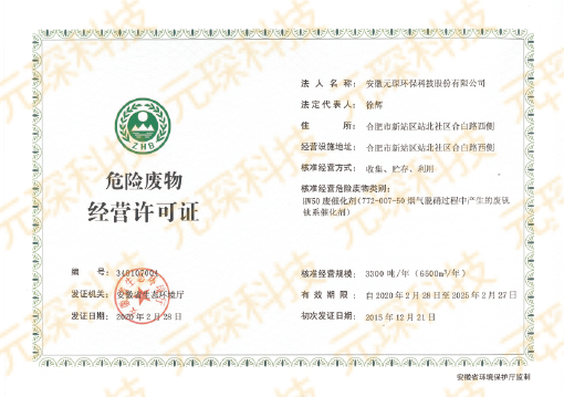 Yy易游体育科技2013年开始投入废旧脱硝催化剂再生技术研究,获得 安徽省环保厅颁发的废烟气脱硝催化剂危险废物经营许可证,标志着Yy易游体育科技成为国内脱硝催化剂生产和再生跨领域内拥有自主知识产权,且拥有国家环保部门授权的危废经营资质的环保企业。Yy易游体育科技在为客户提供优质产品的同时,还为客户一次性解决废旧脱硝催化剂再生难题